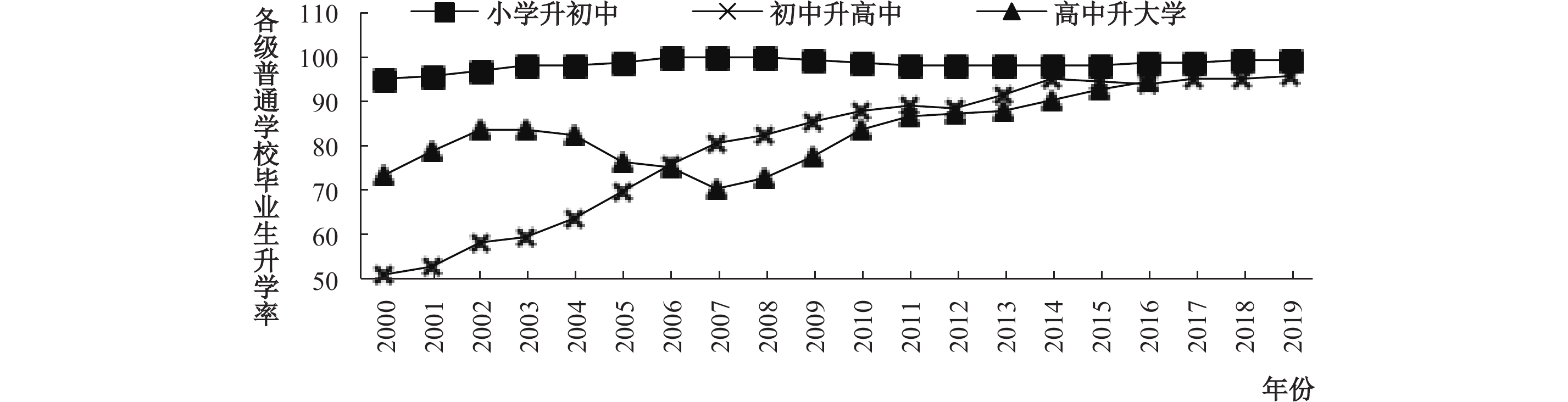 教育是提高人民综合素质、促进人的全面发展的重要途径。21世纪以来,中国在提高广大人民群众受教育水平上取得了显著成就。图1显示,近20年我国义务教育阶段小学升学率呈现平稳发展态势,在2019年达到99.5%;初中升学率大幅跃升,从2000年的51.2%提高到2019年的95.5%。得益于1999年高校扩招政策的实施,高中升学率在2016年超过90%。可见,现阶段我国已基本建成义务教育全面普及、高中教育趋向普及、高等教育从大众化到普及化的教育体系。