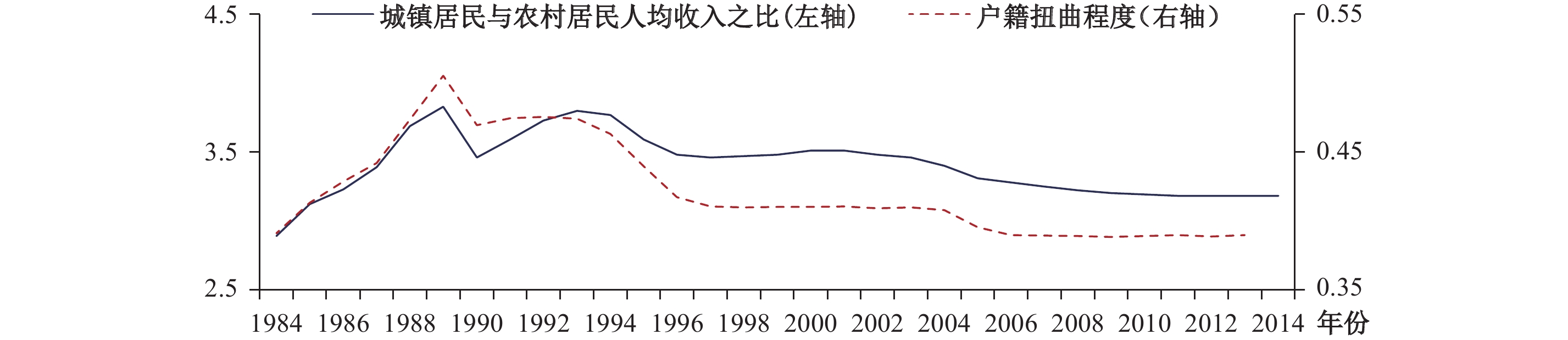 从经济学逻辑来看,户籍扭曲程度和城镇居民人均收入与农村居民人均收入之比应当有很强的正向关系,即城镇居民一般是在非农部门就业,城镇居民人均收入很大程度上体现了非农部门工资率的变化。而农村居民一般是在农业部门就业,即使农村居民一年中有一段时间会在非农部门工作,但其人均收入还是在很大程度上体现了农业部门的工资率变化。由于我国非农部门的工资率明显高于农业部门,因此当户籍扭曲程度变大时,进入非农部门的农业户口工人变少,对应的城镇居民的人均收入增长比农村居民的更快,两者人均收入之比变大;而当户籍扭曲程度变小时,城镇居民与农村居民的人均收入之比变小。从图1可以发现,户籍扭曲程度和城镇居民与农村居民的人均收入之比具有很强的正相关性,这在一定程度上说明了本文所计算的户籍扭曲程度具有很大的可信度。