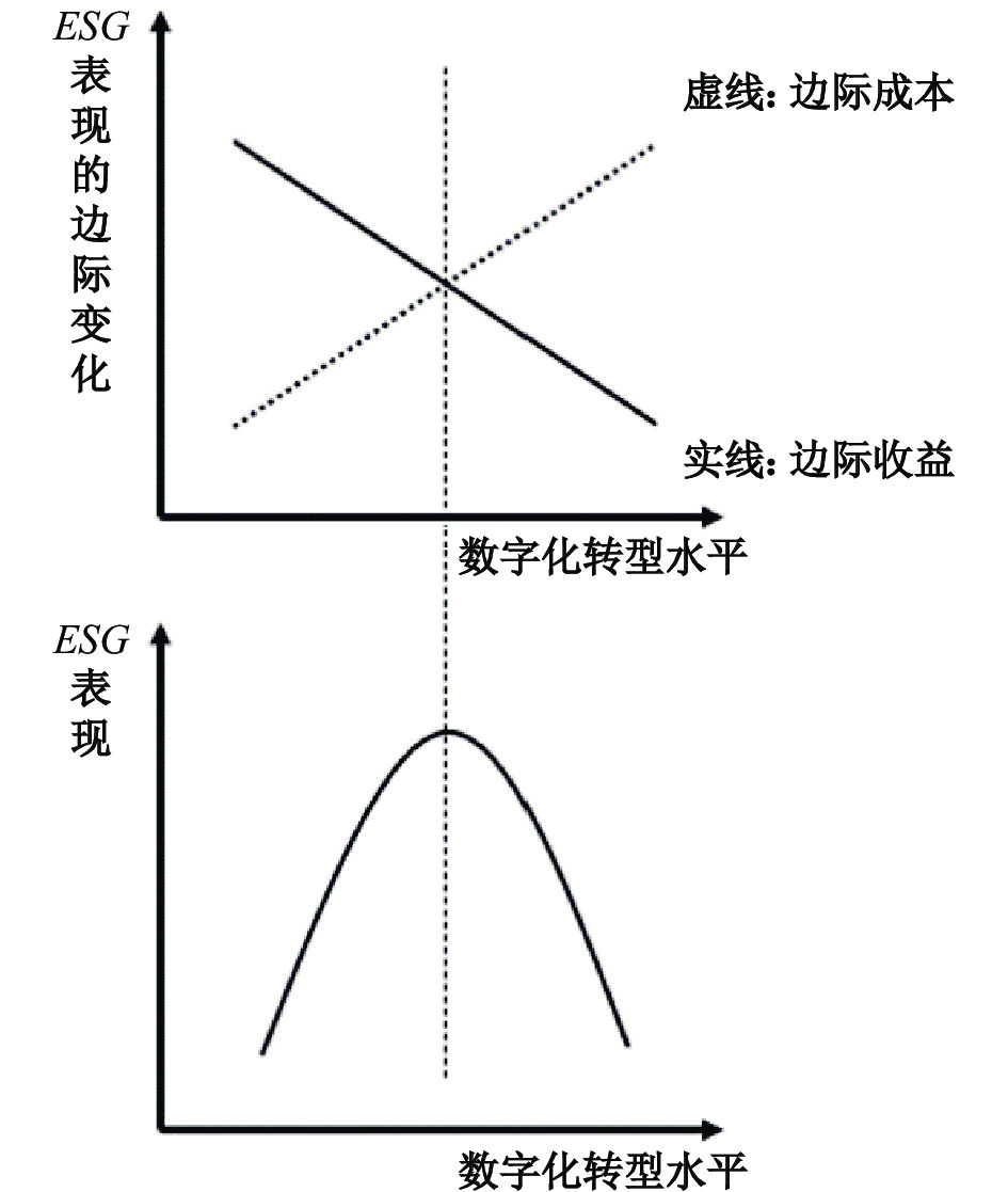 伴随着ESG的兴起与广泛应用,学者们围绕其进行了广泛的理论与实证研究。相比于关注企业ESG后果的研究,围绕提升企业ESG表现机制路径的相关研究起步较晚(Gillan等,2021),其中大多以ESG中的单个维度为切入口。例如,李欣等(2022)发现,公众环境诉求是倒逼企业提升环境绩效的重要力量;肖红军等(2021)发现,企业数字化对企业社会责任具有明显的赋能效应,能够显著改善企业社会责任表现,并讨论了上市公司股权结构、高管激励与治理效率的关系。随着ESG理念的兴起,后来的学者逐渐意识到这三个维度的整体性,并将研究重点从企业在单维度上的表现拓展至企业ESG的整体表现(Gillan等,2021),从高管的股票质押行为、股东参与、党组织治理和制度环境等方面探究影响企业ESG表现的前因(Barko等,2022;Jang等,2022;柳学信等,2022;王禹等,2022)。然而,这些研究仍不足以解释企业数字化转型对ESG表现的具体影响,无法为企业在数字时代的发展提供有效指导。直到近期,二者之间可能的直接联系才逐渐被学者注意到。最新的研究探究了企业数字化转型在其ESG表现中发挥的作用(Fang等,2023;胡洁等,2023)。研究发现,企业数字化能够降低代理成本,提高企业声誉,从而提高治理和社会维度得分。然而,这几项研究仅仅注意到企业数字化转型的积极影响,可能是由于数字化转型和ESG均属于相对新兴的研究领域,已有结合两个领域的研究暂未对二者可能的消极影响展开讨论,从而导致研究结论更多聚焦在积极影响上,忽略了可能的非线性关系。实际上,如前文所述,围绕数字化转型的后果,已有学者形成了不一致的结论,其消极影响也越来越被关注(Trittin-Ulbrich等,2021)。本文在已有研究基础上,深入探究数字化转型与ESG表现之间可能的复杂关系及作用机制,试图填补已有研究的空缺。