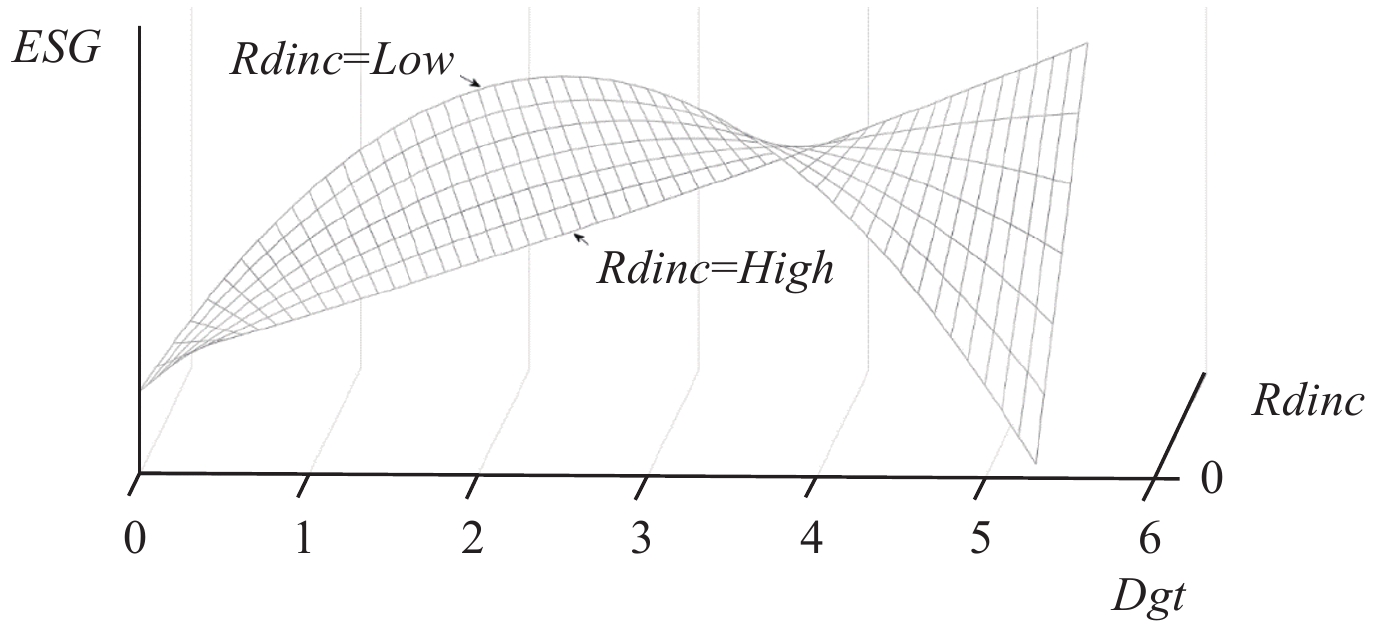类似地,企业数字化转型程度过高可能会减弱其提高ESG表现的动机。第一,数字化转型程度过高可能会转移企业对ESG的注意力。过高的数字化转型程度表明企业对数字技术和数字战略赋予充分的重要性,并可能会依赖数字化转型获得竞争优势,这一行为通常是高管团队分配注意力的结果(Ocasio,2011)。然而,高管团队的注意力是有限的,当数字化转型占据了高管团队绝大多数的时间、精力和资源时,他们无暇同时顾及其他目标,ESG也不例外(解学梅和韩宇航,2022)。此外,当企业在数字化转型层面投入过多时,为了合理化其行为并放大数字化转型的优势,企业往往倾向于将数字化塑造为核心竞争力(Lengnick-Hall,1992),这会降低企业对ESG表现重要性的判断。第二,在信息披露层面,过高的数字化转型水平诱使企业信息披露带有更强的对数字技术和财务回报的关注。较强的目的性可能会降低信息披露质量,进而无法提供环境、社会和治理维度的高质量数据,不利于企业ESG表现。故数字化转型程度过高可能会转移企业对ESG的注意力,减弱信息披露,进而降低企业提高ESG表现的动机。