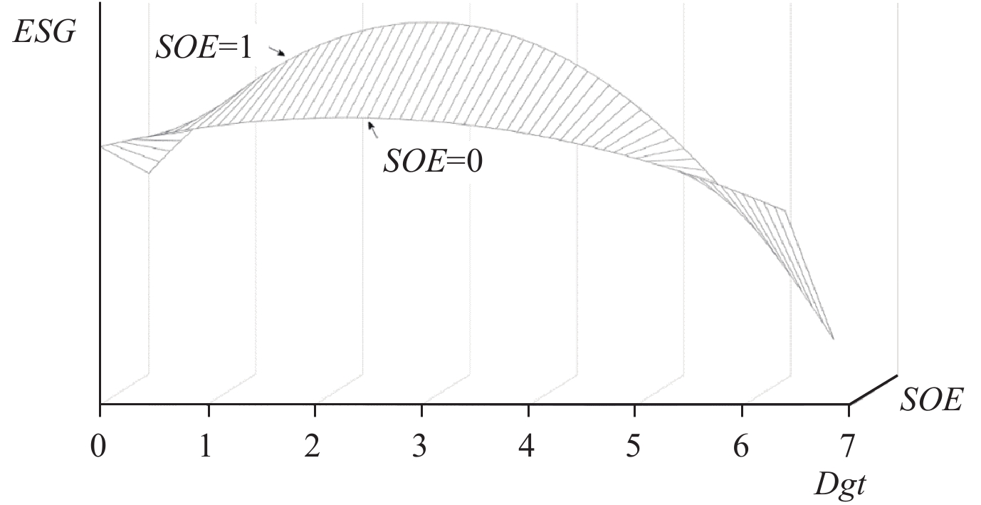 2. 产权性质的调节作用检验。国有企业在我国经济发展中占据重要地位,在支持国家可持续发展战略目标中承担着重要角色。因此,国有企业具有进一步提升ESG表现以符合政府及监管机构出台的ESG相关政策要求的外在动机,从而能够克服企业数字化转型程度过高带来的负面影响。此时,国有企业产权性质使得数字化转型的负向影响在更高的数字化转型水平上才会出现。因此,本文预期国有企业产权性质会调节数字化转型和ESG表现之间的关系,使得二者“倒U形”关系的对称轴向右移动。这意味着国有企业能够在更高的数字化转型水平上实现最佳ESG表现。