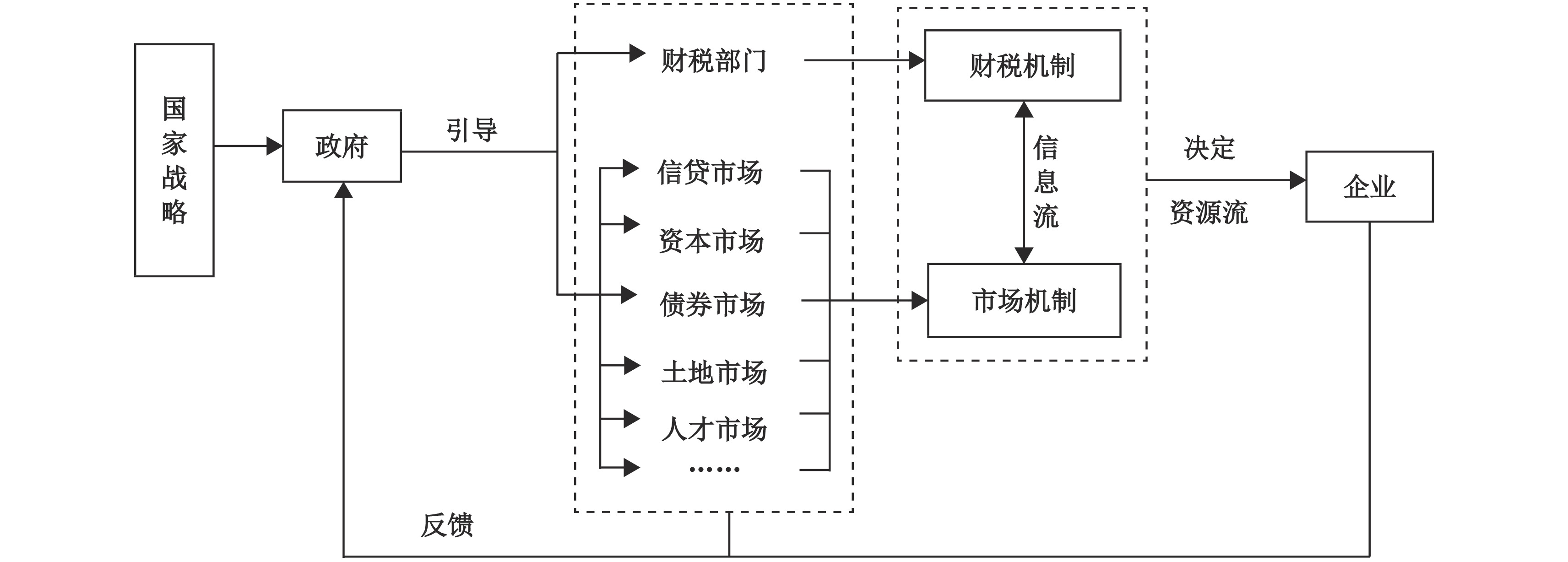 图1呈现了国家战略引导下政府和市场的互动作用如何助力企业发展的逻辑框架。政府以国家战略为蓝图,通过财税和市场相关部门为特定产业和企业提供支持,在这一过程中,相关战略信息在财税和市场机制作用下流通传递,从而引导各类市场资源流向战略支持性行业和企业。同时,企业和市场的信息也传递到相关政府部门,形成反馈机制,从而保障资源配置的合理性和有效性,使得国家战略最终在微观企业层面得以实现。综上所述,政府引导力量和市场配置力量共同构成了中国特色社会主义市场经济的重要元素,也是中国道路自信的具体体现。政府和市场两种手段相互交织、互动协调,两者形成的联动效应服务于国家战略在微观层面的实现。基于以上分析,本文提出以下命题: