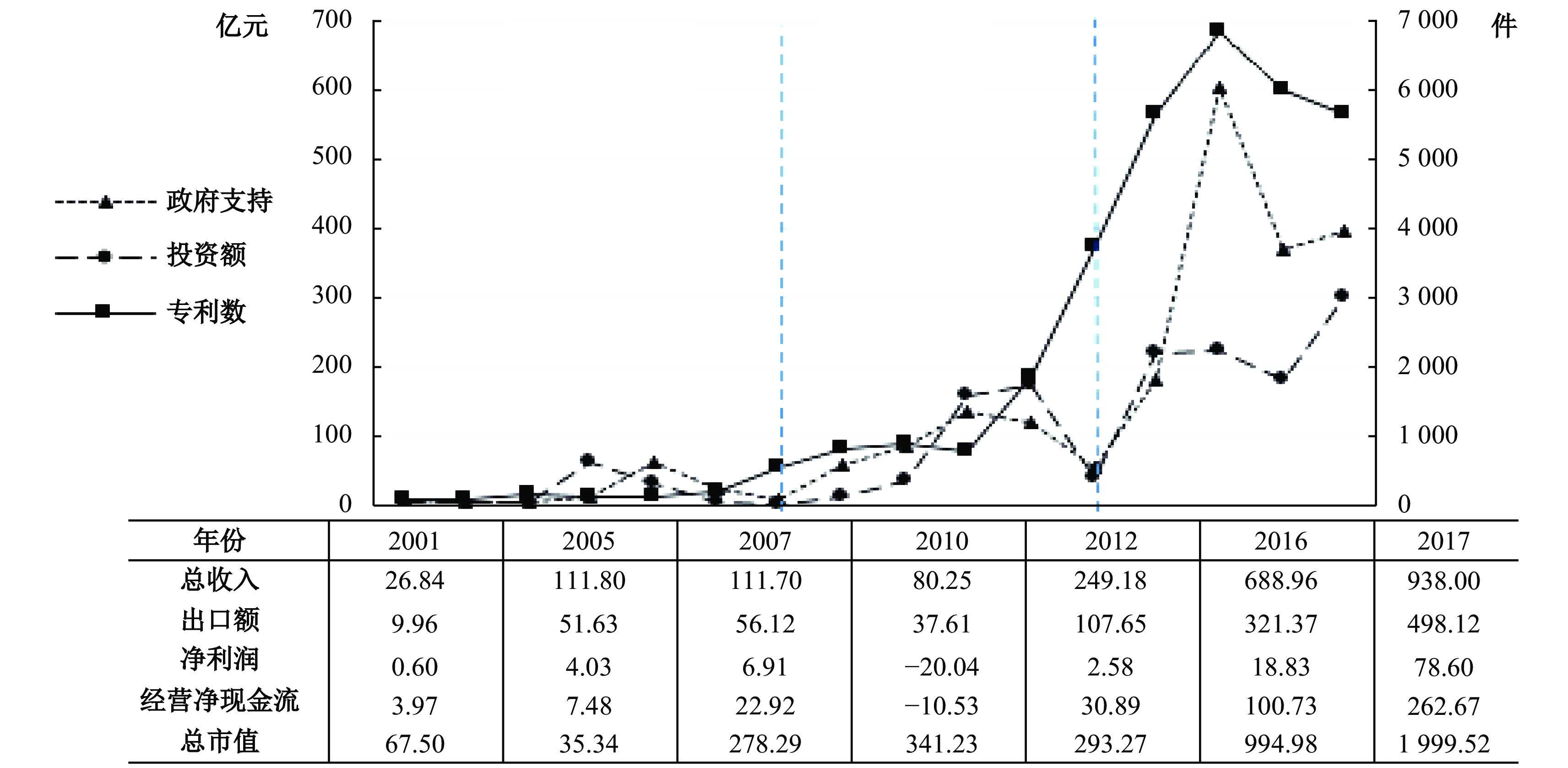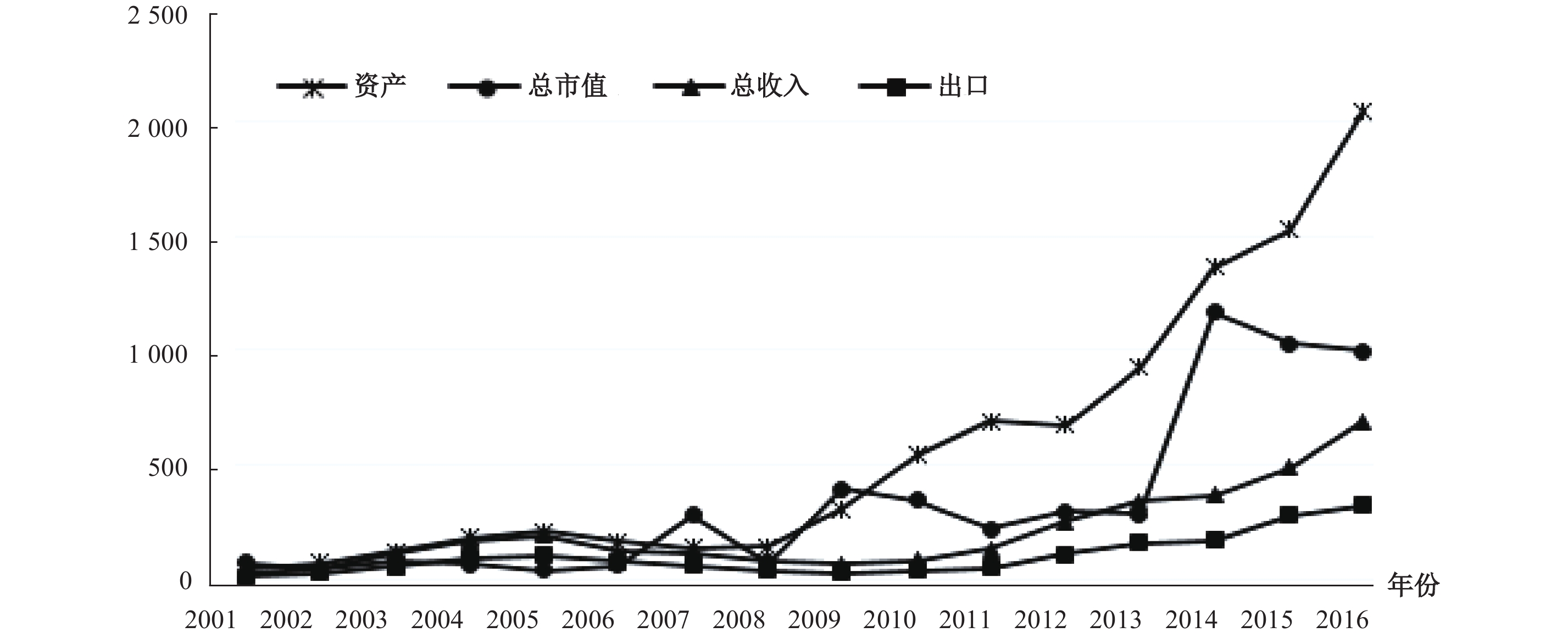 自上市到2016年底,京东方在企业规模、销售、出口以及创新等方面取得了优秀的成绩,尤其是在2012年以后,公司成长速度加快。如图2所示,公司资产规模从40.33亿元增至2 051.35亿元,增长约50倍。2016年,京东方的收入总额为688.96亿元,比上市时增长25倍多;出口额达到321.38亿元,增长32倍;总市值达到994.98亿元,增长近15倍。