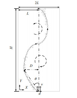 2.3 附壁效应附壁效应[19]又称康达效应,在流体力学中具体指的是高速射流从狭窄的通道突然进入扩大的区域时,射流会进行附壁流动而发生变化。其速度大小会减弱,速度方向会偏向于空腔一侧的壁面。这是由于射流卷吸作用使得射流两侧存在低压区。在压力差的影响下,在低压区的核心区域形成涡旋。在实际扰动的存在下,一旦射流稍微偏向某侧,该侧的涡流加强,造成该侧的低压区压力更低。在这种正反馈循环的驱使下,射流最终会附着在该侧壁面上,形成附壁效应。附壁效应的影响因素主要是外部的流域结构以及内部的射流速度和特性长度。本文研究的是水槽内气泡上升过程的附壁效应及其摆动特性,如图 1所示。