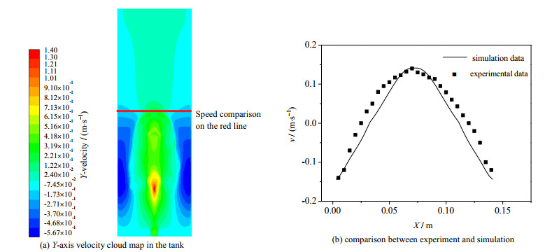 通过与DEEN等[20]实验比较,在瞬时Y轴速度v~曲线处,仿真结果与实验数据吻合较好。在轴向位置中心,VOF模型对Y轴速度的估计略高;而在中心与柱壁之间的区域,轴向速度略有低估。在近壁面区域,实验值的轴向速度比模拟值速度略高,这是造成壁面效应的原因之一。在气液两相同时存在的区域,除了两相之间没有速度滑移外,数据比较是不合理的。中心区域的数据偏差可能是由于不同的滑移条件造成的。验证了本文模拟计算方法的准确性,即用此模型可以对水槽内附壁效应分析。一般情况下,无论是模拟还是实验结果,轴向速度的变化趋势都是相同的,这表明该模型在大多数情况下都能较准确地预测水槽中的气泡上升。