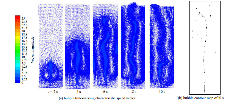 4 结果与分析气泡孔产生的大量气泡在上升中,气泡受壁面影响,上升方式各不相同。计算时间设置为气泡到达自由液面时刻,此时水槽计算区域内的流态已发展充分。以H = 6 m、2L = 2 m、d = 2 mm和v= 25 m·s-1模型为例,分析随时间变化的速度矢量图,结果如图 3(a)所示。从图中看出,气泡从气孔上升,沿着水槽的中心线直线上升,气泡流周围因卷吸而产生漩涡,由于气泡群的不均匀性导致在气泡流两侧形成的漩涡并不相同,从而气泡流两侧产生压力差,左右会蛇形摆动。随着时间变化,气泡流摆幅加剧,漩涡垂向流动,压力差增大,最终可能贴到壁上。取10 s时刻,体积分率为0.5的等值线图,即表示气泡的轮廓,见图 3(b)。