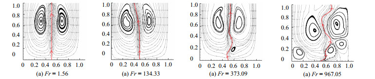 4.1.1 速度场分析图 4是不同Fr下的速度流线图(水平和垂直分别为X和Y方向)。选取气泡流基本垂直上升、单侧偏移、幅度较小的蛇形摆动、幅度较大的蛇形摆动等4组典型算例。从图 4(a)中看出,当Fr较小时,流域内气泡沿着孔口中心线基本垂直上升至自由液面,垂直中心线两侧速度基本对称且产生相反方向漩涡,附壁效应不明显;从图 4(b)中看出,随着Fr的增大,气泡流两侧形成高压和低压区。此时,气泡会向某一侧倾斜,气泡两侧漩涡强度不对称,气泡流偏移侧(即低压区侧)速度变化较剧烈;从图 4(c)中看出,气泡发生蛇形摆动。由于摆动幅度小,流域内也仅有2个漩涡,水槽内除摆动部分以外的速度分布较均匀;从图 4(d)中看出,气泡摆动幅度较大,气泡偏移程度变大,形成多个强度不一的漩涡,水槽内速度分布紊乱,压力损耗变大。这是由于Fr较大时,气泡流对原压力场冲击能力更强,造成的游涡数量更多,影响范围更广,强度更为剧烈。