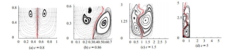 4.2.1 速度场分析图 6为不同高宽比ε下流域内速度流线图。随着ε值不断增大,气泡流从基本垂直上升、单侧摆动、蛇形摆动到附壁。从图中看出,当ε = 0.8时,速度关于垂直中心线基本对称;当ε = 0.86时,流域内存在明显的高低压区,气泡两侧漩涡明显;当ε = 1.5时,流域内存在多个漩涡,气泡流周围流场紊乱;当ε = 5时,气泡在上升中发生附壁效应,在附壁区周围漩涡较大。