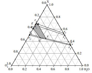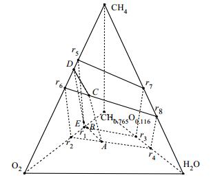 图 1中六面立体r1r2r4r3-r5r6r8r7为无过剩组分时的可行域,在无过剩组分可行域以外,靠近CH4和CH0.765O0.116的立体区域r5r7CH4-r1r3 CH0.765O0.116表示CH4和CH0.765O0.116过剩区,靠近O2和H2O的立体区域r2r6O2-r4r8H2O表示O2和H2O过剩区。