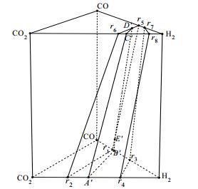 共气化过程中产物分布关系可用图 2中的三棱柱来表示,图 2所示棱柱的上底面对应进料仅为CH4、O2和H2O的甲烷转化体系的产物分布,下底面对应进料为CH0.765O0.116、O2和H2O的水煤浆气化体系的产物分布。与图 1相类似地,图 2中 r1~r8这8个点分别代表 8个反应的产物组成,例如图 2中的点r5代表反应r5的反应物H2与CO摩尔比为2:1。图 2中六面立体r1r2r4r3-r5r6r8r7为无过剩组分时的产物分布区。