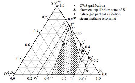 5 结论(1) 利用化学计量关系和热量守恒这两个约束条件,水煤浆与伴生气制备合成气的复杂的反应历程最终可以被简化在三角形图中来分析。