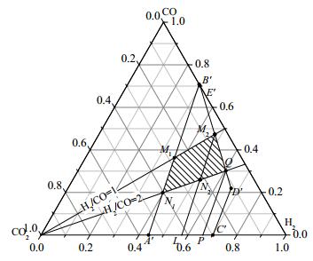 $ C'D':{x_{{{\rm{H}}_{\rm{2}}}}} = 1.819{x_{{\rm{CO}}}} + 2.356{x_{{\rm{C}}{{\rm{O}}_{\rm{2}}}}}{\rm{或}}\frac{{{x_{{{\rm{H}}_{\rm{2}}}}}}}{{{x_{{\rm{CO}}}}}}{\rm{ = }}1.819{\rm{ + }}2.356\left( {\frac{{{x_{{\rm{C}}{{\rm{O}}_{\rm{2}}}}}}}{{{x_{{\rm{CO}}}}}}} \right) $ | (23) |