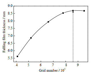 图 1为模型的网格独立性检验,采用1/4物理模型进行模拟计算,在满足精度的情况下缩短计算时间。从图 1中可以看出,随着网格数的增加,液膜厚度也增加,但增长速率逐渐降低。当网格数量增加到8.6×105时,液膜厚度几乎保持不变,因此选择网格数量约为8.6×105进行模拟计算[30]。