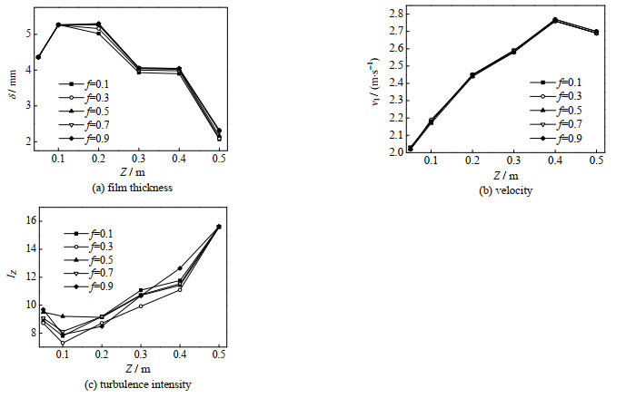 不同摩擦系数f的不同轴向位置的液膜厚度分布如图 10所示。从图中可以看出,摩擦系数对入口区(0.05 m和0.1 m)液膜厚度的影响可以忽略。随着轴向距离的增加,摩擦系数对液膜厚度的影响逐渐突出。从图 10(a)可以看出,随着摩擦系数的增加,液膜厚度略微增加。原因是随着摩擦系数的增加,会对液膜流动产生剪切阻力,导致液体积聚,导致液膜厚度略微增加。摩擦系数对液膜速度的影响很小,几乎可以忽略,这表明摩擦系数对圆管的液膜速度几乎没有影响。从图 10(c)中可以看出,尽管0.05 m和0.1 m处的液膜受到槽出口的影响很大,但摩擦系数对液膜湍流强度的影响不能忽略。随着轴向距离的增加,液膜受“射流”效应削弱。此时,摩擦系数对液膜湍流强度的影响逐渐突出。从图 10(c)可以看出,0.2~0.4 m处的液膜湍流强度随摩擦系数的增加而略有变化。出口处液膜的湍流强度基本不变,这是液膜波动时大波追赶上前一个子波发生碰撞堆积的综合反映。