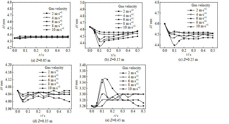 不同气体速度的不同轴向位置处的液膜厚度分布如图 11所示。图 11(a)显示,0.05 m处的液膜受气体速度的影响很小,此处的液膜厚度有略微增加的趋势。随着轴向距离的增加,空气速度对液膜厚度的影响逐渐突出。从图 11(a)、(b)和(c)可以看出,随着气体速度的增加,液膜厚度首先急剧减小,然后缓慢增加,在0.1 s达到最低值。原因是气体速度的增加导致液膜破裂,从而导致液膜厚度急剧减小。然而,随着时间的推移,上部液膜在重力作用下逐渐向下流动,补充缩小区域中的液膜。因此,液膜的厚度呈现缓慢增加的趋势。随着轴向距离继续增加,图 11(e)中的液膜厚度受到位置(b)、(c)和(d)处气体速度的影响,导致液膜厚度急剧增加,后随着时间延长得以补充。