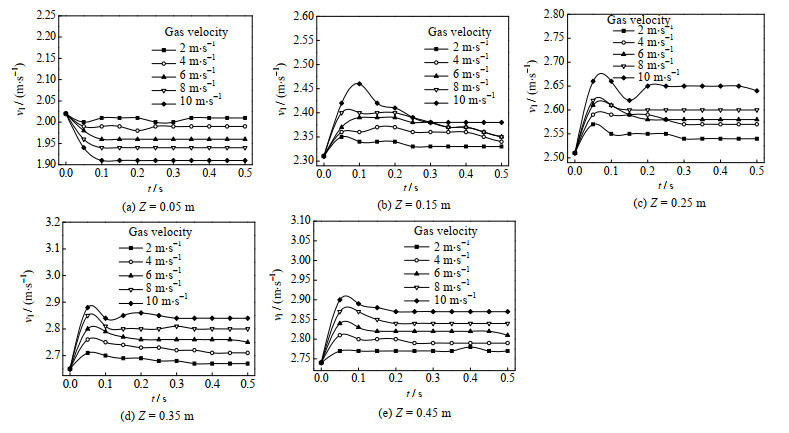 不同气体速度的不同轴向位置下的液膜速度分布如图 12所示。从图 12(a)可以看出,尽管0.05 m处的液膜受槽出口处“射流”效应的影响较大,但气体速度对液膜速度的影响不能忽略。从图 12(a)可以看出,入口区域的液膜速度受气体速度的影响很大,随着气体速度的增加,下降范围增大,但随着时间的推移,液膜速度逐渐趋于稳定。这表明气体速度增加对入口区域的液膜速度具有抑制作用。随着轴向距离的增加,气体速度是影响液膜速度的主要因素。图 12(b)~(e)显示,由于入口区域中液膜和并流气体速度的共同影响,充分发展区域中的液膜速度随着气体速度的增加而逐渐增加,但液膜速度最终随着时间的延长趋于稳定,并且气体速度越大,需要的稳定时间越长,该结果与液膜厚度图一致。