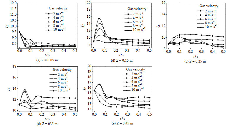 图 13 不同气体速度和不同轴向位置下液膜的IZ分布 Fig.13 Distribution of liquid film IZ at different gas velocities and axial positions |