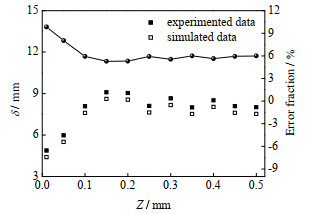 图 2 模拟和实验计算的液膜厚度对比 Fig.2 Comparison of simulated and experimental data of falling film thickness |