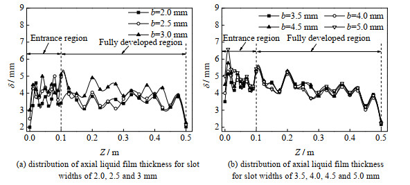 不同槽宽b的不同轴向位置的液膜厚度δ分布如图 3所示。结果表明,在气液接触角θ =0°时,液膜厚度随着轴向距离的增加而逐渐增加。图 3(a)显示,在相同轴向位置处,液膜厚度随着槽宽度的增加而略微增加。而图 3(b)中的液膜厚度几乎不随槽宽的增加而变化。根据液膜厚度的分布分为2个区域:入口区域和充分发展区域,分别对应于轴向距离Z为0~0.1 m和0.1~0.5 m。从图中可以看出,入口区域中液膜厚度的增加幅度较大。相反,液膜厚度在充分发展区域中稳定波动。当槽宽度b为2、2.5和3 mm时,液膜厚度远大于槽宽度。原因是液膜具有较大初始轴向速度和槽缝出口处形成的“射流”效应产生的径向速度的组合效应。此外,侧壁上的挡板将使液膜汇聚到下游中心,导致液膜厚度增加。相反,当槽缝宽度为3.5、4、4.5和5 mm时,入口区域中的液膜厚度略大于槽缝宽度,说明此时的液膜受“射流”效应的影响相对较弱,而充分发展区域中的液膜厚度呈现减小的趋势,因此将3.5 mm定义为临界槽宽度。