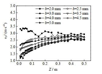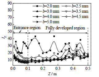 不同槽宽的不同轴向位置的液膜速度vl分布如图 4所示。总体而言,液膜速度随着轴向距离的增加而增加,但增长率逐渐减小。在相同轴向位置,液膜速度随槽宽的增加而减小。其原因是液膜的重力加速度效应大于由壁面剪切应力τw和涡流黏度εm引起的摩擦阻力效应。然而,由于此次研究的是高湍流条件下充分发展区域内液膜的流动特性,因此液膜的波动非常剧烈。当槽宽为2.0 mm时,液膜速度波动显著,原因是槽宽太小时形成的液膜受固体壁的约束较大,当液膜从“无限空间”到“半无限空间”时,液膜波动加剧,因而速度波动较剧烈。