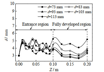 选取为3.5 mm的槽缝宽度进行管径d对液膜波动特性的影响研究,不同管径的不同轴向位置的液膜厚度分布如图 6所示。从图 6中可以看出,入口区域0~0.01 m的液膜厚度突然增加。然后在入口区域0.01~0.1 m,相同轴向位置处的液膜厚度随着管径的增大而减小。原因是曲率半径较大的管道侧壁上的液膜倾向于沿周向扩散,并且管道直径越大,扩散越严重,导致形成的液膜稳定性差。相比之下,当管径为73 mm时,液膜厚度的减小幅度最小。同样,在充分发展区域也可以观察到相同的规律,因此73 mm管径是形成良好和稳定液膜的最佳选择。