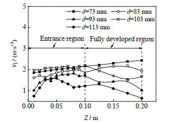 不同管径d的轴向位置的液膜速度分布如图 7所示。由于槽缝出口处形成的“射流”效应和重力的共同影响,当管径为93 mm和113 mm时,入口区域0~0.01 m的液膜速度突然增加,后大幅度减小。原因是曲率半径较大的管道侧壁上的液膜倾向于周向扩散,且管径越大,扩散越严重,形成的液膜稳定性越差。相反,当d=73 mm时,液膜速度增加缓慢,符合连续性方程。