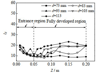 图 8显示了不同管径的不同轴向位置下液膜的轴向湍流强度IZ分布。从图 8中可以看出,随着轴向距离的增加,IZ首先迅速减小,后波动幅度不一。入口区液膜的IZ曲线降低幅度最大,表明液膜波动剧烈。原因是液膜受到洗涤冷却环出口结构的影响,这对应于图 6所示的膜厚度变化趋势。当管道直径大于73 mm时,侧壁流动的液膜的湍流强度剧烈波动,表明管径增大不利于形成良好且稳定的液膜。其原因是由曲率半径较大的管径形成的液膜倾向于周向扩散。相比之下,当管径为73 mm时,形成的液膜的湍流强度在充分发展区域呈现稳定的波动趋势,表明该管径有利于形成良好、稳定的液膜。