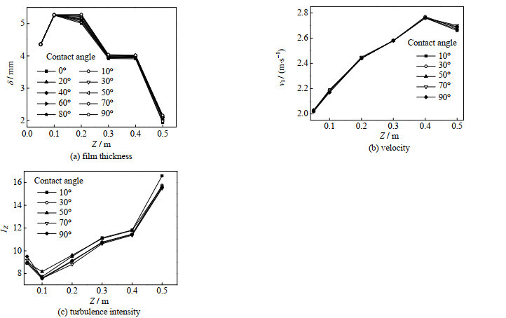 在流动过程中,降膜与气体的接触是动态的,因此气液接触角也会动态变化。当液膜较薄时,动态接触角等于静态接触角,因此研究中使用的接触角为常数。不同气液接触角的不同轴向位置的液膜厚度、速度和湍流强度分布如图 9所示。选择0.05、0.1、0.2、0.3、0.4和0.5 m的6个轴向固定点,分析气液接触角对液膜厚度、速度和湍流强度的影响。从图中可以看出,在0.05 m和0.1 m处的液膜受槽出口“射流”效应的影响很大,气液接触角对液膜厚度的影响可以忽略。随着轴向距离的增加,液膜受到“射流”效应逐渐削弱。此时,气液接触角对液膜厚度的影响逐渐突出。从图 9(a)中可以看出,随着气液接触角的增加,液膜的厚度略有增加。从图 9(b)可以看出,入口区域和充分发展区域之间的边界点处的液膜速度随着气液接触角的增大而略微减小。尽管随着轴向距离的增加,气液接触角对液膜速度的影响仍然很小。从图 9(c)可以看出,随着气液接触角的增大,Z=0.1~0.5 m的液膜湍流强度在一定程度上略有降低,尤其是在出口处。