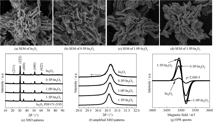 3 结果与讨论 3.1 催化剂的结构表征采用水热和煅烧结合的方法进行催化剂制备,制备过程如图 1所示。首先通过水热法得到纳米花In(OH)3,再对In(OH)3进行煅烧得到In2O3,通过控制对In2O3在含还原性的PH3气氛中热处理的时间来调控P的掺杂量并构建氧空位,得到P掺杂和氧空位共改性In2O3催化剂xP-In2O3。采用SEM对In2O3、xP-In2O3进行表征,如图 2(a)~(d)所示,可以看出In2O3呈现片堆积纳米花状形貌,在磷化后,xP-In2O3的形貌也呈现相似的纳米花结构。