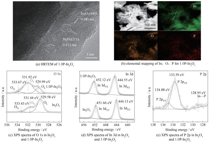 对催化剂进行TEM和XPS表征,进一步确定材料的晶格状态和表面元素的化学态。如图 3(a)所示,在1.0P-In2O3的HRTEM图中观察到晶格条纹为0.413 nm和0.180 nm,对应In2O3的(211)和(410)面一致[26]。同时可以看出,杂原子P的掺杂使1.0P-In2O3的晶格条纹出现明显的晶格错位[27]。此外,对1.0P-In2O3进行了EDS元素分析,结果如图 3(b)所示。可以看出P、O和In元素均匀分布。图 3(c)为O 1s XPS图谱,可以看出未改性In2O3中显示出结合能为529.58、531.44、533.43 eV的谱峰,分别归属于晶格氧、缺陷氧以及吸附的OH物种[28]。1.0P-In2O3的缺陷氧对应谱峰显著增强,表明氧空位数量明显增加,与EPR结果一致。1.0P-In2O3具有较高的氧空位浓度,导致O原子周围电子密度减小,对应结合能升高[29]。图 3(d)为In 3d XPS图谱,与In2O3相比,1.0P-In2O3的In 3d向高结合能明显偏移,这是P掺杂导致电子再分布,In周围电子部分转移到P,使得In电子密度降低。对于1.0P-In2O3的P 2p XPS图谱(图 3(e)),位于128.95 eV处的峰对应于In—P的2p轨道峰,133.59 eV和134.88 eV处的峰归属于与空气接触形成的磷酸盐物种,分别对应P—O 2p1/2和2p3/2。以上表征结果一致表明,采用水热和煅烧结合的方法成功制备了P掺杂和氧空位共改性In2O3催化剂xP-In2O3。