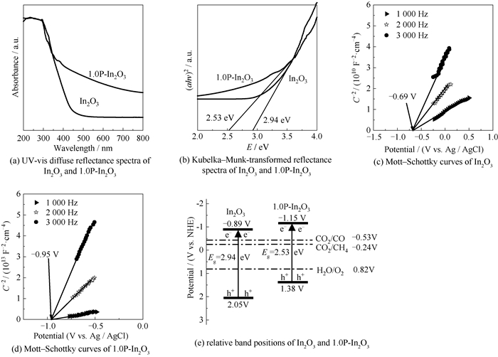 通过UV-vis漫反射谱图对In2O3和1.0P-In2O3的光吸收特性进行分析。如图 4(a)所示,In2O3的吸收边缘为450 nm,可见光范围内的吸收较差。相对于In2O3,1.0P-In2O3吸收边缘出现明显红移,表明氧空位和P掺杂可以促进对可见光的吸收。进一步以Kubelka-Munk方程进行计算催化剂的带隙,得到结果如图 4(b)所示,In2O3和1.0P-In2O3的带隙宽度分别为2.94 eV和2.53 eV。采用Mott-Schottky (M-S)曲线法,进一步确定In2O3和1.0P-In2O3的价带和导带电势位置。如图 4(c)、(d)所示,In2O3和1.0P-In2O3的平带电势分别为-0.69 V和-0.95 V (vs.Ag/AgCl,pH = 7),相应导带电位分别为-0.89 V和-1.15 V。由EVB = Eg-ECB计算得到In2O3和1.0P-In2O3的价带电位(EVB)分别为2.05 V和1.38 V。基于以上计算和分析结果,得到In2O3和1.0P-In2O3的能带结构如图 4(e)所示。可以看出1.0P-In2O3具有比In2O3有更负的导带电势,表明1.0P-In2O3具备更强还原能力,可提供具有更高能量的电子用于CO2还原。