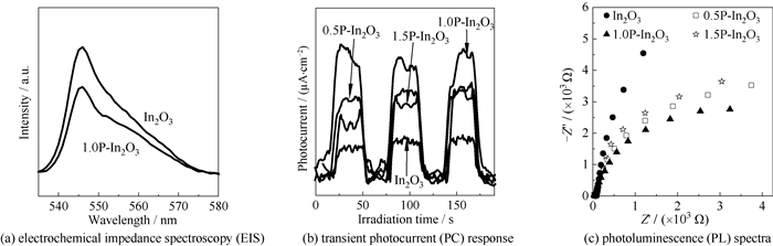 光生载流子的分离和迁移效率对光催化剂的性能至关重要。对制备的催化剂进行光致发光(PL),瞬态光电流(PC)响应和电化学阻抗谱(EIS)分析,结果如图 5所示。图 5(a)为In2O3和1.0P-In2O3的PL光谱结果,在激发波长为400 nm光照下,未改性In2O3在547 nm左右显示出一个强峰,表明内部光生载流子的高复合率[30]。而1.0P-In2O3的峰强度明显降低,说明P掺杂以及氧空位共改性后,光生电子-空穴复合得到有效抑制[31]。这可能是由于氧空位和P掺杂在In2O3的带隙内产生了电子陷阱,当电子从价带中得到激发时,它们将移向这些陷阱,而不是直接移动到导带,这种电子陷阱的存在降低了电荷载流子的传输距离,抑制了光生空穴和电子的复合[32]。光电流密度的大小与半导体的电荷转移效率高低紧密相关[33]。在300 W氙灯条件下(780 nm > λ > 320 nm)对制备的催化剂进行光电流密度测试,结果如图 5(b)所示。可以看出光电流密度大小顺序为1.0P-In2O3 > 0.5P-In2O3 > 1.5P-In2O3 > In2O3,说明1.0P-In2O3具有最高的光生载流子分离效率。图 5(c)为EIS结果,1.0P- In2O3具有最小的圆弧半径,表明光生电荷具有最快迁移速率[34]。以上结果一致表明P掺杂和丰富的氧空位促进了光生电荷转移和分离,有利于CO2的多电子深度还原[35-36]。