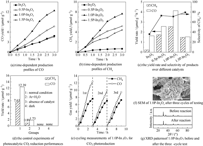 采用气固体系对In2O3、xP-In2O3的光催化还原CO2性能进行评价。由图 6(a)、(b)可知,光催化还原CO2产物由CO和CH4组成,并且产量均随光照时间延长而增加。产物生成速率对比如图 6(c)所示,未改性In2O3的产物生成速率最低,主要产物为CO,仅有微量CH4产生。而xP-In2O3的催化剂性能均提高,随着P掺杂量增加,CO与CH4生成速率均表现出先升高后降低的趋势,与光电性能结果一致,可能是过量P造成了光生电子与空穴复合,降低了光催化性能[37]。其中1.0P-In2O3的CO生成速率为4.13 μmol·g-1·h-1,CH4生成速率为2.54 μmol·g-1·h-1,分别是未改性In2O3的2.6倍和12.5倍,CH4选择性由36.0% 变为71.1%,催化剂的还原CO2活性和CH4选择性得到提高。为了进一步探究催化剂、光和CO2的作用,进行了条件控制实验(图 6(d))。当反应体系中未通入CO2时,检测到微量的CO和CH4,这可能是1.0P-In2O3在空气中暴露吸附的CO2所致。因此,在1.0P-In2O3光催化还原CO2的过程中,CO2是产物CO和CH4的唯一来源[38]。在黑暗条件或不添加催化剂时未检测到CO和CH4生成,表明光照和催化剂是光催化还原CO2为CO和CH4的必要条件。由图 6(e)可知,在3次完整循环测试中,1.0P-In2O3的催化性能没有明显降低。另外,对3次循环后的1.0P-In2O3进行了SEM和XRD表征,如图 6(f)、(g)所示,经过3次循环后,1.0P-In2O3依然保留了花状结构,并且1.0P-In2O3的特征衍射峰在3次循环未发生明显变化,说明1.0P-In2O3具有较好的稳定性[39]。