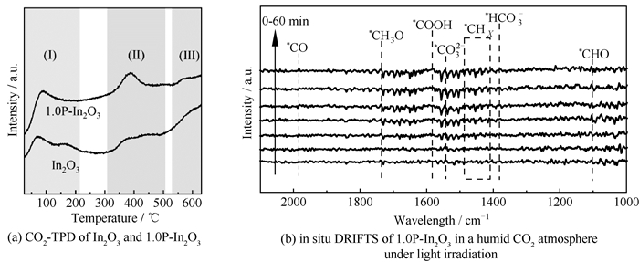 对1.0P-In2O3进行了机理研究,以揭示其光催化还原CO2活性和CH4选择性提高的工作机理,包括CO2的吸附能力测试和原位中间体研究(图 7)。采用CO2-TPD分析了In2O3和1.0P-In2O3对CO2的吸附能力,结果如图 7(a)所示。在220 ℃以下区域Ⅰ中,脱附峰是由物理吸附的CO2和表面羟基吸附的CO2造成的[40]。在310~510 ℃区域Ⅱ中,CO2的脱附峰对应表面氧空位所吸附CO2的化学脱附[21],而位于530~630 ℃区域Ⅲ的脱附峰归因于在催化剂表面以碳酸盐形式吸附CO2的脱附[13]。经P掺杂和氧空位共改性之后,1.0P-In2O3相对于未改性的In2O3在区域Ⅰ和Ⅲ峰值强度没有明显的变化,但位于区域Ⅱ中的脱附峰有了明显的增强,这说明1.0P-In2O3对CO2的吸附方式发生了显著改变,并且丰富的表面氧空位有助于吸附和活化CO2,改变还原CO2的反应路径,这是导致CH4的产物选择性提高的重要因素。