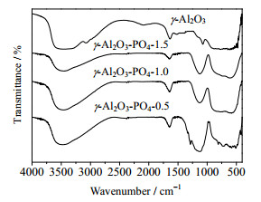 图 1 不同磷含量的γ-Al2O3红外谱图(KBr压片) Fig.1 FT-IR spectra of γ-Al2O3 modified with different amounts of phosphorus acid (KBr pressed) |