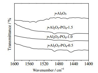 氧化铝作为常用催化剂载体,其酸碱性质对许多催化反应具有重要意义。本文采用吡啶红外光谱对催化剂酸性位点进行分析,结果如图 2所示。可以看出,未经磷酸改性的催化剂表面没有明显的酸性特征峰;经磷酸改性以后,在1 445 cm-1出现吡啶与Lewis酸位点结合的特征峰,此Lewis酸位点主要是由磷与氧所形成的不饱和P─O及氧化铝经磷改性后,四配位的Al产生更强的吸电子能力引起的[17-19]。在1 540 cm-1附近没有明显特征峰出现,即1 490 cm-1附近的吸收峰主要是由吡啶与Lewis酸位点结合引起的。从表征结果可以得知,磷酸改性γ-Al2O3表面酸位点主要为Lewis酸。
