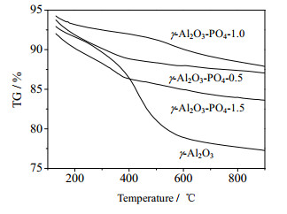 图 4为不同磷酸含量修饰γ-Al2O3热重曲线。样品的失重主要由4种状态的水或羟基的损失引起:最先为表面吸附水,其次是孔道吸附水,最后是结晶水和结构水。通过磷酸改性以后,氧化铝表面的部分羟基被磷物种取代,使得与Al离子键联的羟基数量减少,从而抑制氧化铝在高温条件下的脱羟基反应,提高氧化铝的稳定性,这与文献报道一致[19, 21]。磷含量过高或过低,均不利于样品保持比较好的稳定性。研究表明,当磷酸含量为1 mol·L-1时,磷以单层分散形式存在于γ-Al2O3表面,此时样品稳定性最好[18]。