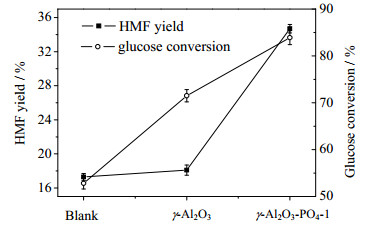 葡萄糖作为生物质的主要组成单元,以其为原料转化为生物基化学品更具研究意义。由于葡萄糖的吡喃环结构更加稳定,且分子中含有许多羟基,极易发生副反应,如何绿色、高效地将葡萄糖进行转化是生物质领域面临的关键问题之一,也是科研工作者面临的难点问题[1, 8, 10, 12]。随着人们对绿色化工和环境保护关注度提高,采取绿色友好、酸性可调、可重复使用的固体酸取代传统质子酸催化剂已成为当今催化领域的重要研究方向[13-15]。γ-Al2O3以其多孔性结构和较大的比表面积在催化方面具有广泛应用;且γ-Al2O3表面具有不完全配位的铝原子和前驱体的大量羟基使其具有一定的酸性,可作为固体酸催化剂或载体使用。因此本文以γ-Al2O3作为催化剂载体,对不同浓度H3PO4溶液浸渍得到磷改性的γ-Al2O3的结构、性能及催化葡萄糖脱水转化HMF活性进行研究。