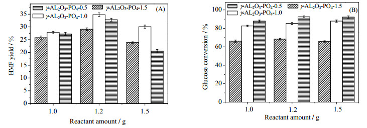 图 6为不同磷酸浓度改性下γ-Al2O3催化葡萄糖转化为HMF结果。从图 6(A)可以看出,对于不同葡萄糖反应物浓度,磷酸浓度为1.0 mol·L-1改性所得到的催化剂,催化葡萄糖生成HMF效果更好一些。这可能是由于当磷酸浓度为1.0 mol·L-1时,磷在氧化铝上可达到单层分散最大值,此时样品具有最佳催化性能[18];磷浓度过高或者过低,使得样品表面催化活性物种分布不均匀,使其稳定性和催化性能均有所下降。结合NH3-TPD表征结果可以看出,当磷酸浓度升高时,催化剂的酸性位点数也随之升高,而磷酸浓度过高,反而不利于HMF生成,这可能是由于当磷含量较多时,过量的酸位点引起副反应增加,进而影响其催化选择性[23]。此外,由于HMF生成过程中伴随着大量副反应,反应物浓度过高或过低均不利于葡萄糖脱水生成HMF,当葡萄糖加入量为1.2 g时,HMF含量最高,进一步增加葡萄糖浓度,HMF收率反而降低,表明反应物浓度过高易引起副反应的发生。图 6(B)为在不同催化剂催化下葡萄糖的转化情况,从图中可以看出,随着磷酸浓度的升高,葡萄糖转化率也相应升高,结合NH3-TPD表征结果可以得知,随着磷酸浓度的提高,催化剂具有更多的酸性位点,这些酸性位点可以催化葡萄糖转化,从而使得葡萄糖转化率增加。