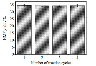 与均相酸相比,可重复使用是非均相固体酸的一大优势。因此,每次实验结束后,将催化剂分离干燥后用于下一次实验,对1.0 mol·L-1磷酸改性的γ-Al2O3催化葡萄糖转化为HMF稳定性进行考察,结果如图 7所示,可以看出,在含水体系中催化剂重复使用4次,催化活性未发生明显改变,表明经磷酸改性的氧化铝对糖脱水转化HMF表现出很好的催化稳定性。