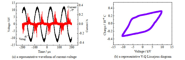3 结果与讨论 3.1 DBD放电特性如图 1(a)所示,DBD输出电压为典型的正弦波形,实验中周期固定为0.1 ms。输出电流的波形类似正弦波,但波峰和波谷附近叠加了高振幅的脉冲式波动。由于DBD的电流、电压间存在的相位差及介质损耗,有效放电功率难以直接测量。介质表面电荷量可通过串联一个合适的电容来准确测量,因此通常通过表面电荷-放电电压的利萨如(Lissajous)图形来分析DBD放电功率。图 1(b)为典型的V-Q lissajous图形,其形状大致为一个平行四边形,其面积的大小代表了有效放电功率的大小,其值为33 kW。