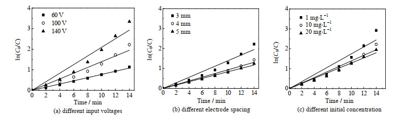 为研究实验条件参数(输入电压、电极间距、初始质量浓度)对DCF降解的影响并进行系统分析,采用式(1)一阶动力学模型拟合DCF的降解过程: