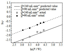 从式(24)可以看出,DCF单次流过放电区域的转化率不仅与输入功率和电极间隙有关,还受到溶液流速的影响。为验证模型的准确度,保持其他条件不变,在不同流速下(Q=90 mg·min−1和240 mL·min−1),改变输入功率,通过式(24)计算得到预测值,与实验值进行对比,结果如图 6所示。