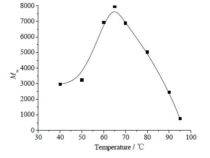聚酯反应温度分别考察了40、50、60、65、70、80、90和95℃。如图 1所示,当反应温度从40提高到65℃,重均分子量也明显不断升高。随着温度继续升高,重均分子量反而降低。温度高于最适温度时,脂肪酶的催化活性降低;当温度过高(80℃、90℃和95℃),脂肪酶容易变性失活。所以最适反应温度为65℃。