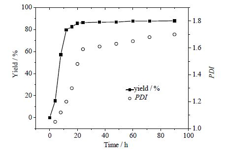 一般酶催化聚合反应可以通过适当地延长反应时间来提高聚合度,但是这样产物的PDI也可能变大。由图 2可以看出,PDI和产率的曲线趋势相似。在优化的条件下(65℃、10%脂肪酶、单体纯度99%),从0到24 h,两条曲线都增幅较大,反应24 h,产率达到86.31%,PDI为1.59。延长反应时间,产率和PDI的增长都趋于平缓。因此,最优反应时间为24 h。