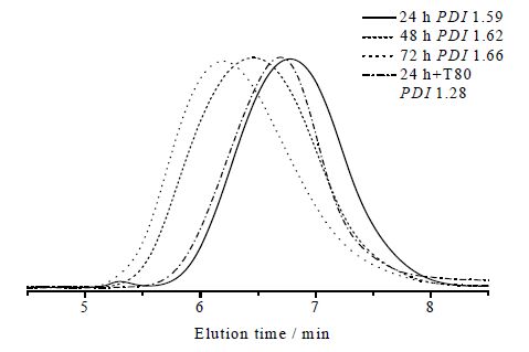 由图 3可知,考察了不同的反应时间(24 h、48 h、72 h)对重均分子量和分子量分布的影响。反应时间越长,SEC曲线的流出时间越短,分子量越大,分子量分布越宽。反应24 h与同等条件加15 mg⋅mL-1的吐温80相比较,则加吐温80合成的聚合物分子量分布明显变窄。说明表面活性剂吐温80对缩聚反应的聚合度和分子量分布都有很好的控制。