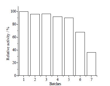 脂肪酶Candida sp.99-125呈粉末状均匀分散在反应体系中,并不溶解,因此便于循环使用。脂肪酶的重复使用可以通过过滤、乙醇洗涤和真空干燥来实现。在同样的反应条件下进行循环使用实验,根据每次反应的产率与第一次反应的产率比,计算相对活性。图 4表明,脂肪酶非常稳定,通过5次循环使用相对活性仍然保持在90%以上。如果继续循环使用,相对活性直线下降。