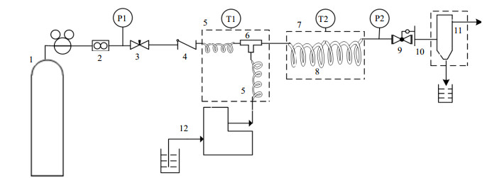 实验主要仪器包括高压输液泵(LC-500A,杭州旭昱科技有限公司)、T型混合器(SUS-1/16,杭州旭昱科技有限公司)、气体质量流量控制器(CS200,北京七星华创电子股份有限公司)、不锈钢微通道管(0.762 mm I.D.×20 m,上海济成分析仪器有限公司)和背压阀(RW75,杭州宝研仪表有限公司)。