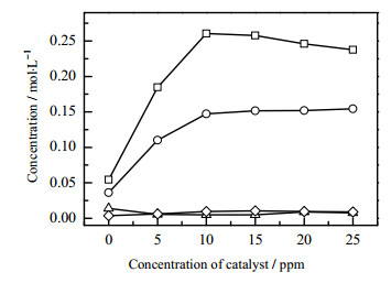 图 10 催化剂用量对产物浓度的影响 Fig.10 Effects of catalyst amount on product concentration ‒□‒ cyclohexanol ‒○‒ cyclohexanone ‒△‒ CHHP ‒◇‒ adipic acid |