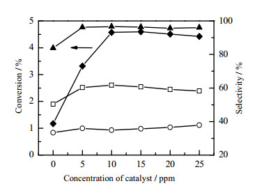 3.5 催化剂用量的影响环己烷液相氧化是一个典型的自由基链式反应,添加催化剂有利于活性自由基的生成,从而加快氧化反应速度。二价有机酸钴盐(环烷酸钴、硬脂酸钴或辛酸钴)常用于催化有机物氧化,其催化作用表现为二价钴遇氧或过氧化物被氧化为三价钴的同时,伴随了活性自由基的生成,从而加快了反应进程[1]。实验中采用环烷酸钴(Ⅱ)为催化剂,固定表观液体流速为0.004 m·s-1,表观气体流速为1.80 m·s-1,反应温度165℃,反应压力1.4 MPa,引发剂浓度0.2%(wt),考察了催化剂浓度(0 ppm ~ 25 ppm)对反应的影响,结果见图 10和图 11。